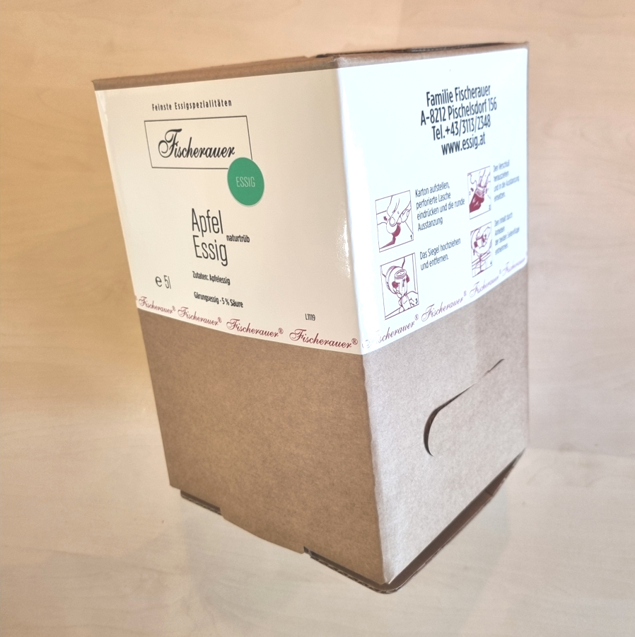 Direkt gepresster Apfelsaft aus besten steirischen Äpfeln wurde zu einem eleganten Apfelessig verarbeitet. Ein feinfruchtiger, aromatischer Apfelessig aus dem Hause Fischerauer. Hergestellt aus dem frisch gepressten Saft von Idared, Jonagold und Braeburn Äpfeln. Dadurch bleibt der volle Genuss erhalten, sowie alle wertvollen Inhaltsstoffe. Abgefüllt in 5 Liter Bag in Box, so daß Sie jederzeit zu Hause frischen Apfelessig dosiert verwenden können. Der Essig ist naturtrüb. Öltipp: Kürbiskernöl