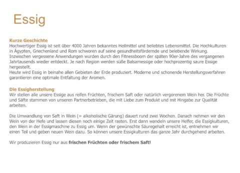 Wir produzieren Essig nur aus frischen Früchten oder frischem Saft!